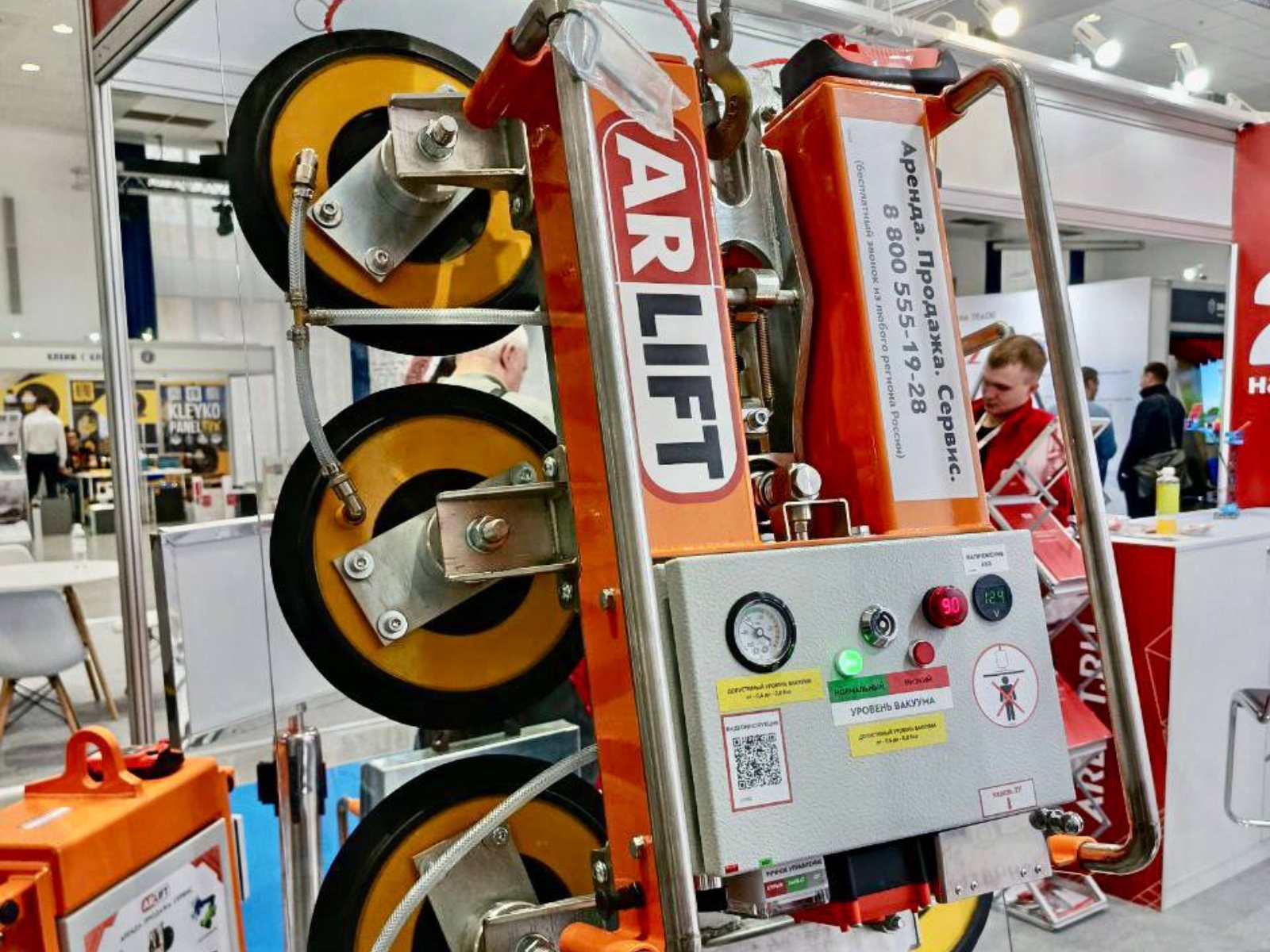В выставочной зоне мы презентовали линейку вакуумных захватов собственного производства — ARLIFTER SP-4, ARLIFTER FR 2500А и ARLIFTER GS-R-600A. Оборудование закрывает большинство задач по монтажу стекла, светопрозрачных конструкций и сэндвич-панелей — без риска для материалов и значительно быстрее ручного формата.