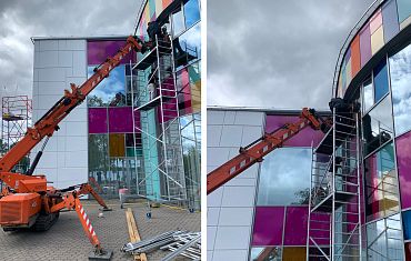 Ножничный подъёмник AS1012, вакуумный захват Arlifter GS-500 и кран-манипулятор помогли заменить испорченные противопожарные стекла с гелевым заполнением.