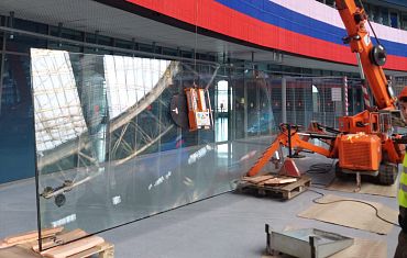 Мини-кран и вакуумный захват компании Арлифт помогли с монтажом стекла весом около 700 кг на одном из стадионов Северной столицы.